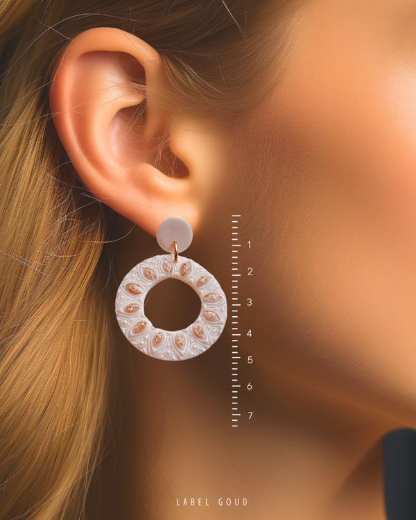 Aisha is een ronde oorbel in gebroken wit met mandala design en glitter accenten.
