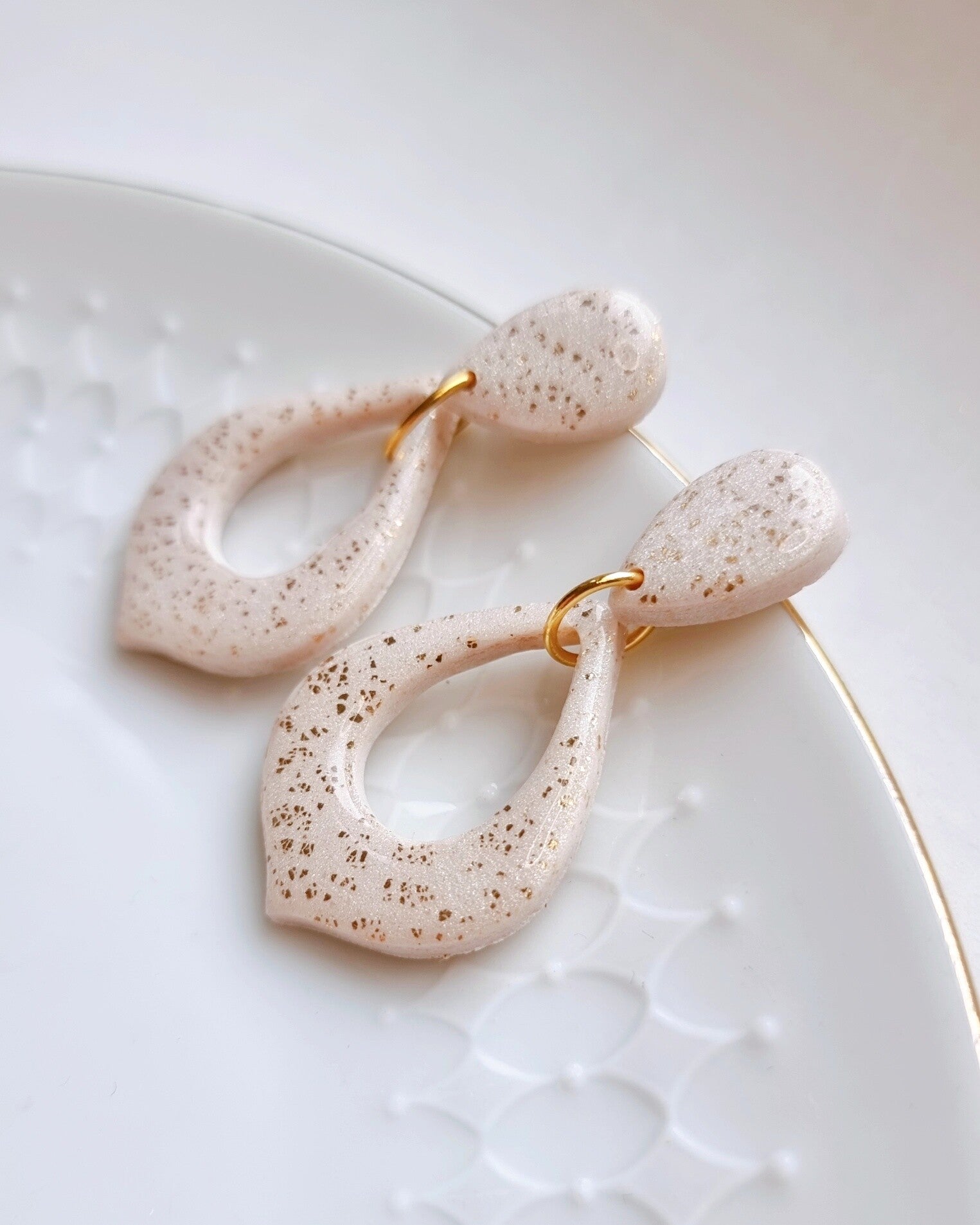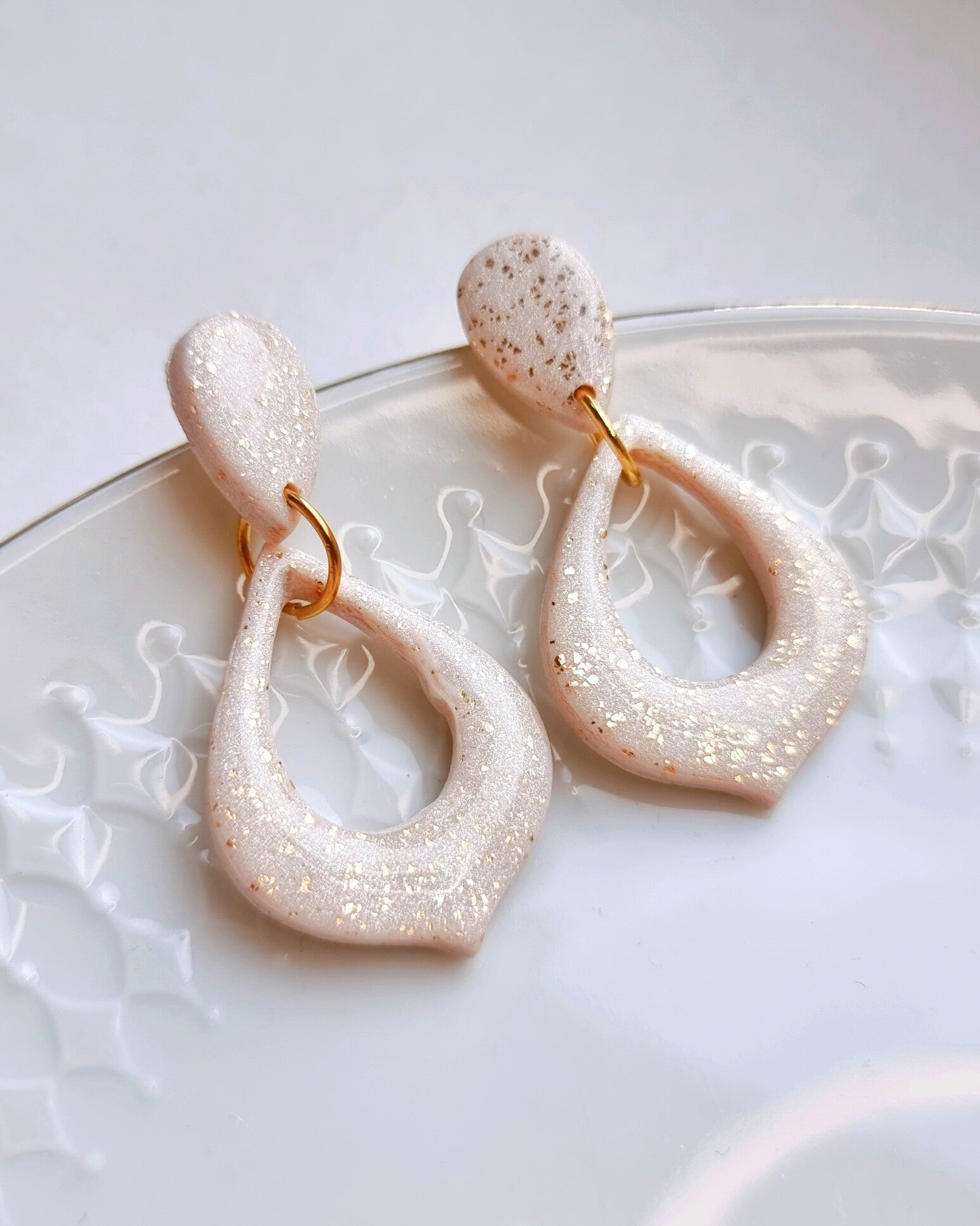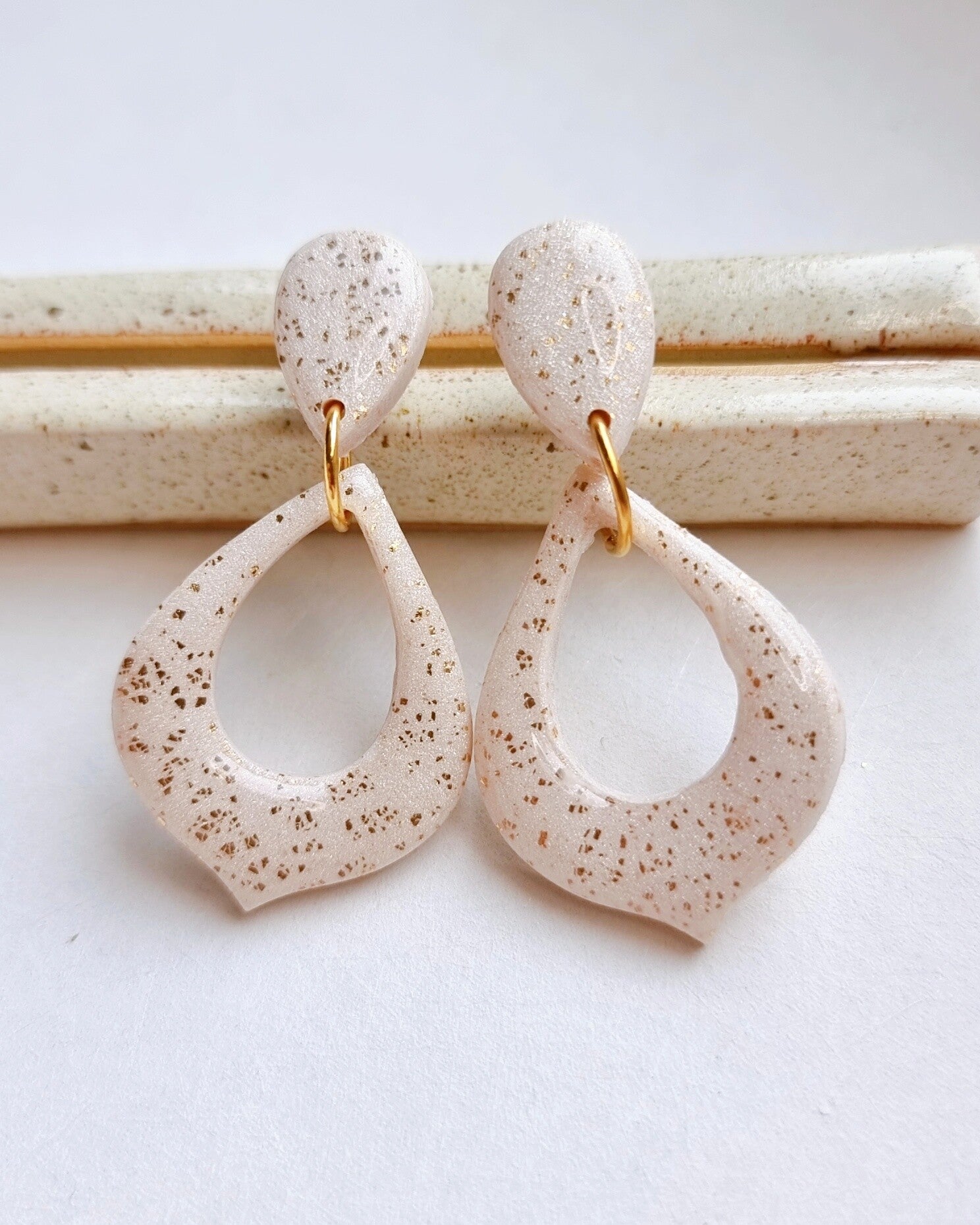 Senna, een lieve set in een druppel vorm met Marokaanse punt. Ivoor kleurig parel klei met gouden flakes.